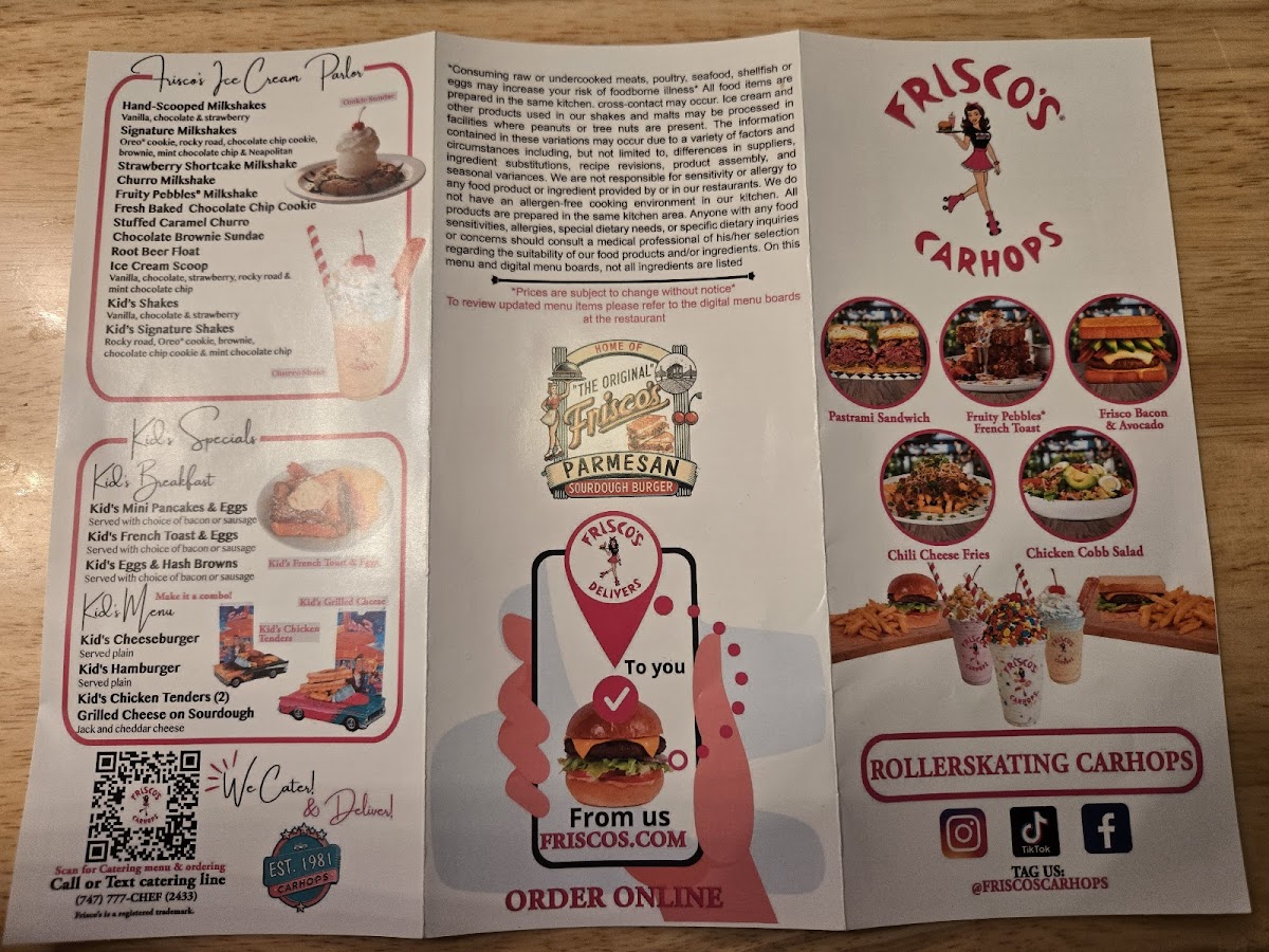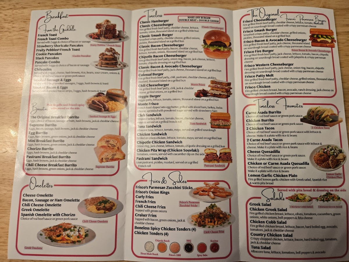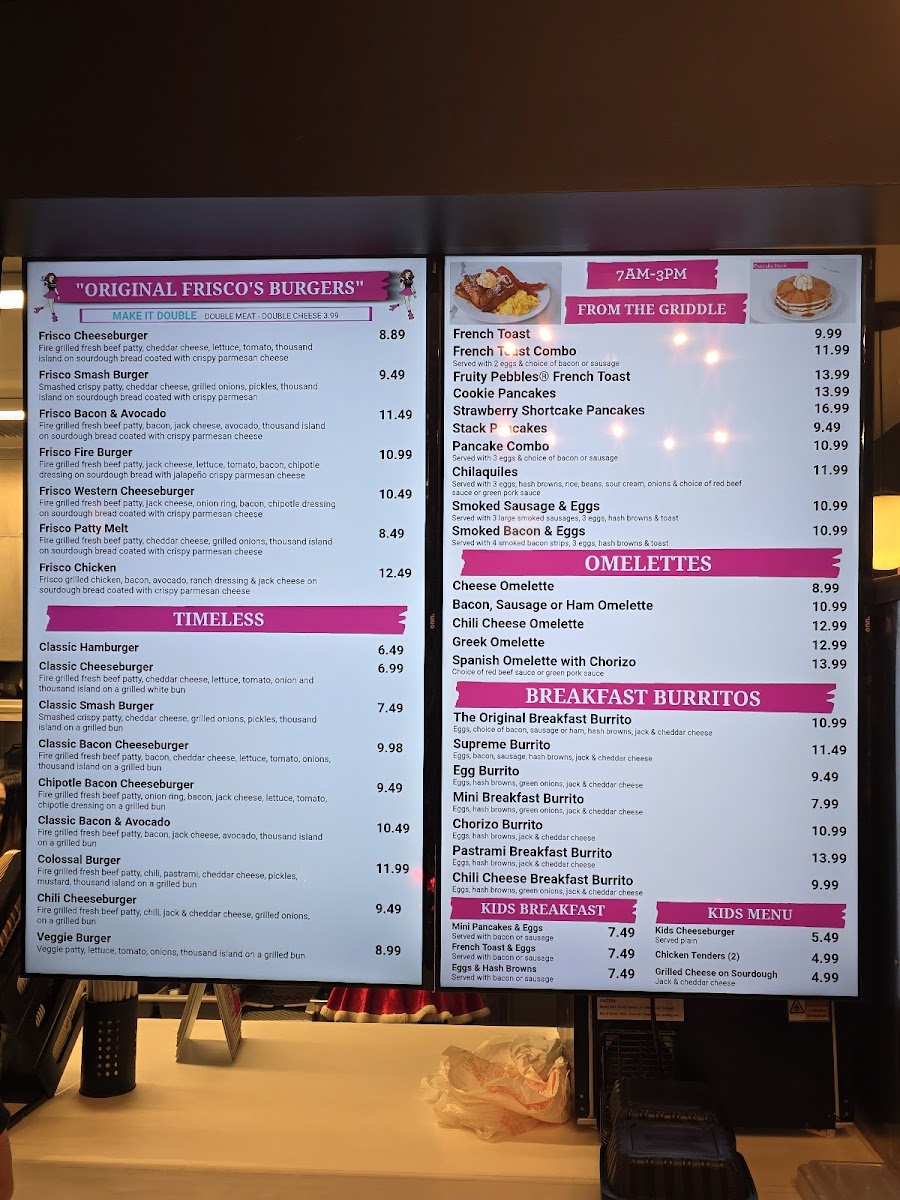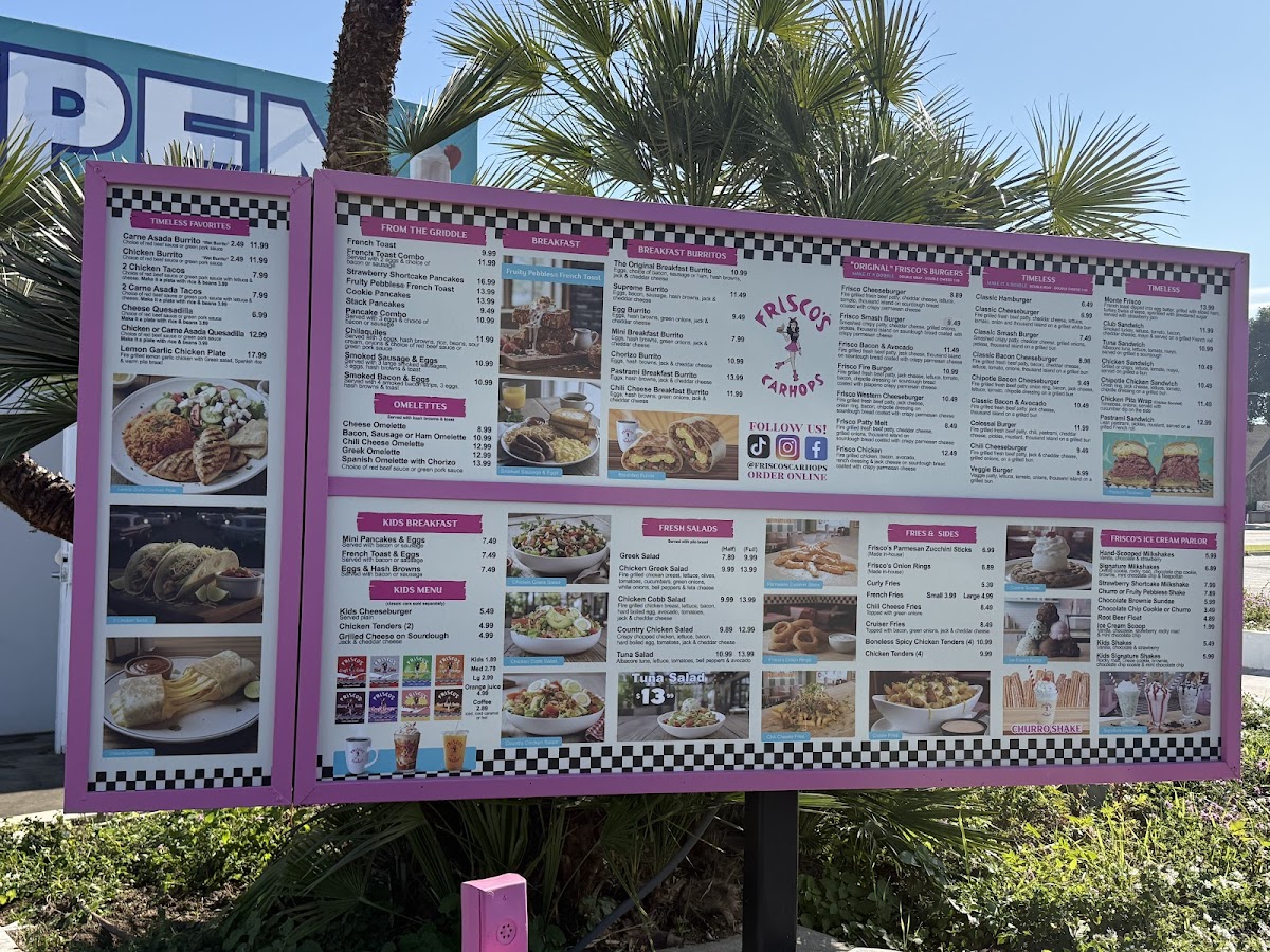 Frisco’s Carhops offers a straightforward and approachable menu, centered around familiar American diner favorites. The selection includes casual bites like classic burgers, quesadillas, and sandwiches designed to satisfy cravings throughout the day. Whether you're stopping by for a quick breakfast burrito in the morning or settling in with a Philly cheesesteak and onion rings later on, the menu reflects a relaxed, old-school drive-in atmosphere that encourages easy, comforting dining.